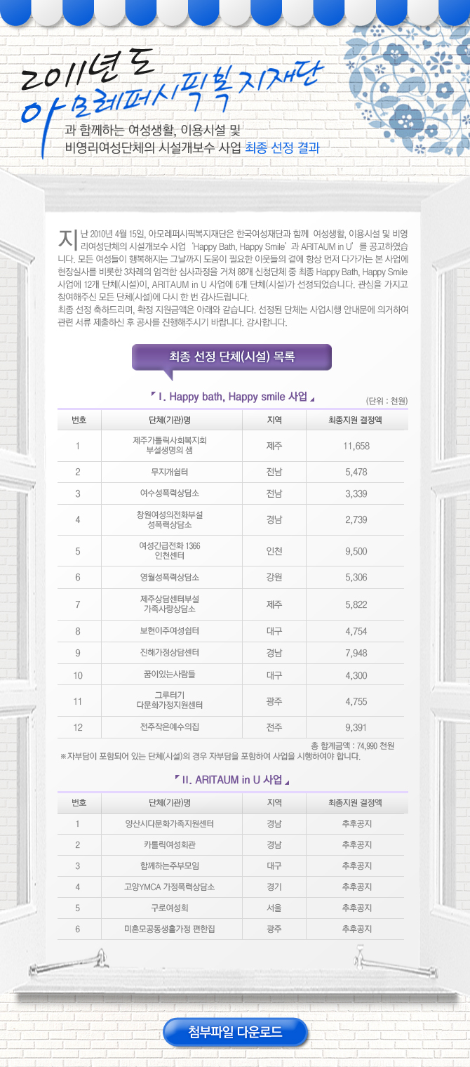 2011년도 아모레퍼시픽복지재단 시설개보수사업 최종 선정 결과